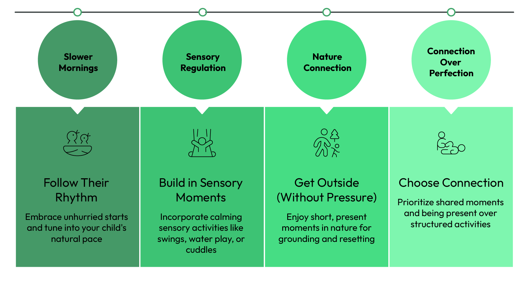Incorporate activities your child enjoys swings, water play, planting something small, deep pressure like blankets or cuddles, or quiet time. When your child feels regulated, it creates more ease for you too.